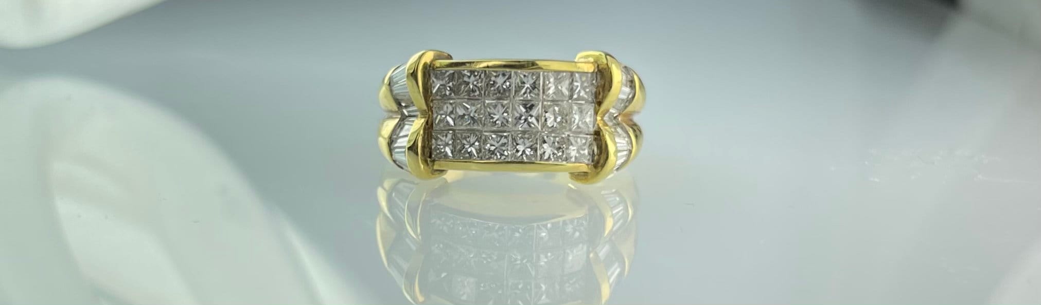 18K Yellow gold band ring with invisible set princess & baguette cut diamonds 2.50CTTW